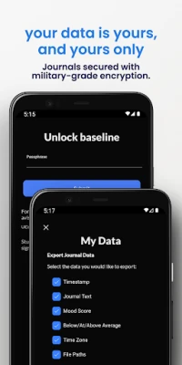 We know we’re dealing with really sensitive information here, so we’re committed to keeping your personal information 100% secure. Everything you write and upload to baseline is encrypted, so we can’t even see what you’ve written. You can also protect your data in-app against people who might have access to your device.